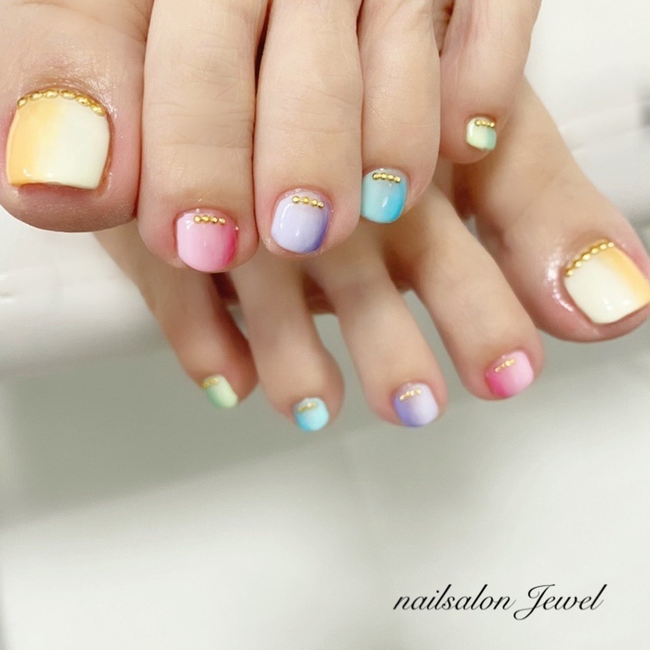 輝く神秘的な指先に! 夏のトレンドはラメグラデーション 今年のトレンドはグラデーション ネイル です。 特に気になるのが ラメ のグラデーション! 指先にキラキラとした印象ちゅるんとした薄いグラデーションネイル。かき氷のシロップのような見た目で涼し気です♡ 21年夏のフットネイルデザイン② 光沢のあるパステルレインボーネイル。存在感があります*